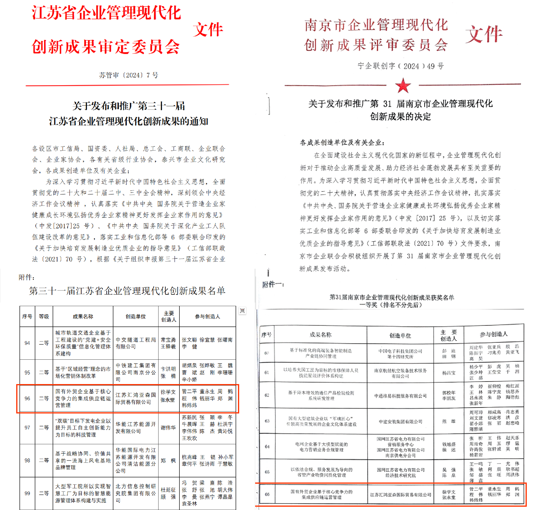 近日,第三十一屆江蘇省、市兩級企業管理現代化創新成果評審結果先后發布,我司《國有外貿企業基于核心競爭力的集成供應鏈運營管理》成果榮獲江蘇省企業管理現代化創新成果二等獎、南京市一等獎。該評審由江蘇省、市兩級企聯及工信、人社、國資等相關部門聯合發文組織實施,江蘇省共207家企業、南京市共有110家獲獎。