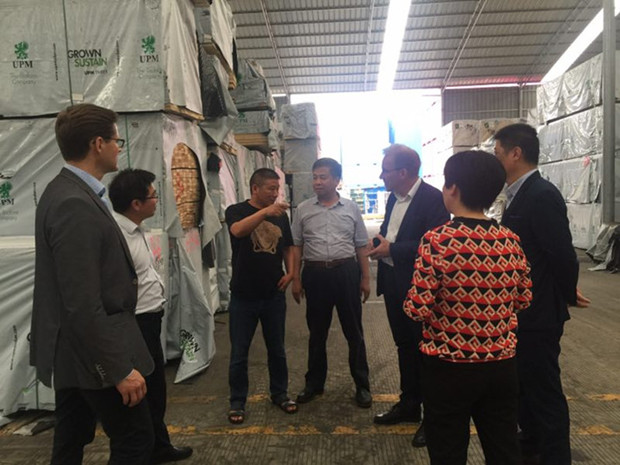 考察間隙,蔣金華副總裁還利用倉庫現場簡陋的辦公室會見了芬蘭UPM公司高級副總裁ESA先生一行,就UPM公司的紙漿、板材與匯鴻集團相關子公司的合作情況做了深入交流,并就下一步深化合作達成共識。
