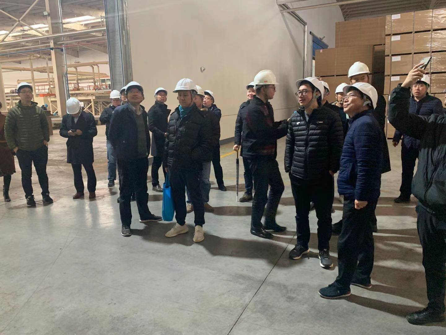 考察小組一行首先參觀了亞森同匯工廠的全自動生產線、中控室、堆料場、切片廠、成品倉,了解了從原木到密度板的整個生產工藝流程。亞森同匯的板材生產線全部采用全球一線品牌設備,并且在軟件控制、質量管理方面狠下功夫,實現了板材的數字化、智能化生產,從而將傳統模式下需要3000多人的操作團隊縮減到38人,效率和質量都得到了大幅提升,在業內處于領先地位。隨后,考察組還參觀了亞森同大工廠的膠合板貼面生產線,加深了對整個板材加工全流程的理解和認識。