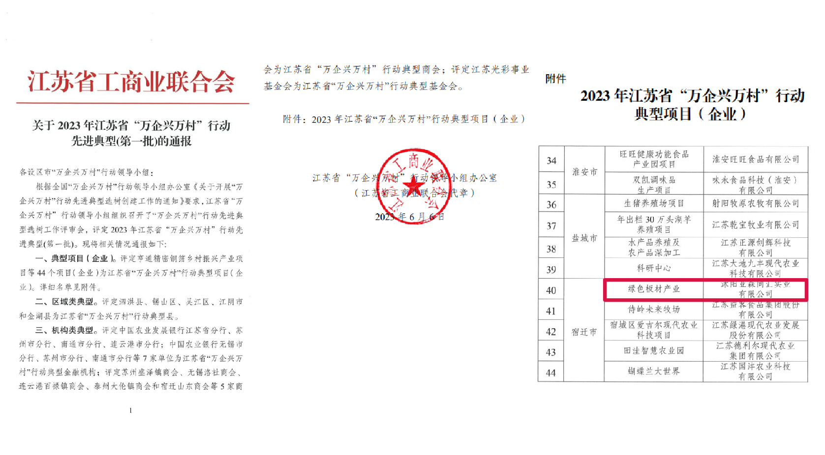 近日,江蘇省“萬企興萬村”行動(dòng)領(lǐng)導(dǎo)小組發(fā)布了《關(guān)于 2023 年江蘇省“萬企興萬村”行動(dòng)先進(jìn)典型(第一批)的通報(bào)》,我司年產(chǎn)40萬立方米中(高)密度板生產(chǎn)實(shí)體項(xiàng)目——沭陽亞森同匯實(shí)業(yè)有限公司入選2023年江蘇省“萬企興萬村”行動(dòng)典型項(xiàng)目(企業(yè))。