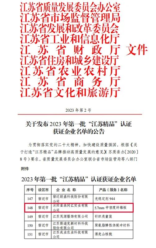 近日,江蘇省質量發展委員會辦公室聯合省市場監管局等八部門共同評定了2023年第一批“江蘇精品”認證獲證企業名單,我司參股投資的年產40萬立方米中(高)密度板生產實體項目——沭陽亞森同匯實業有限公司產品“5.7mm中密度纖維板”成功獲得認證。