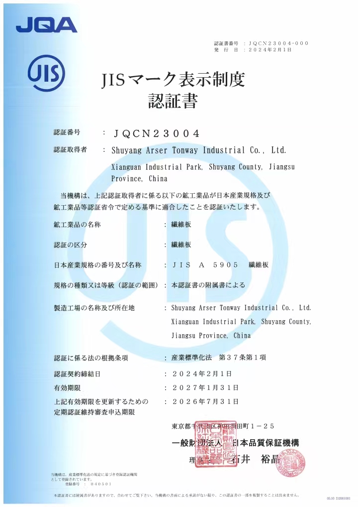 我司參股投資的沭陽亞森同匯成功通過日本JIS認證,獲頒JIS證書。