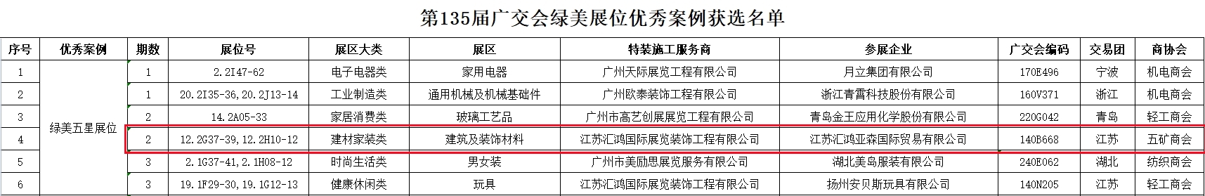 為鼓勵廣交會特裝展位設(shè)計創(chuàng)新、材料創(chuàng)新,提升展位展示效果,中國對外貿(mào)易中心集團(tuán)有限公司于第135屆廣交會開展綠美展位優(yōu)秀案例征集活動。按照《廣交會綠美展位優(yōu)秀案例征集辦法》,經(jīng)過圖紙審核、現(xiàn)場核查、專家初審和復(fù)審等程序,共產(chǎn)生綠美五星展位6個、綠美四星展位13個、綠美三星展位20個,獲獎單位將獲得展位及位置優(yōu)先安排、特別宣傳報道等多項獎勵。我司憑借出色的展位設(shè)計與卓越的展位展示效果,在眾多參展商中脫穎而出,榮獲“綠美五星展位”。這一殊榮既是對我司尤其是參展團(tuán)隊創(chuàng)新能力的肯定,也是對特裝施工服務(wù)商--匯鴻會展專業(yè)能力的高度認(rèn)可。